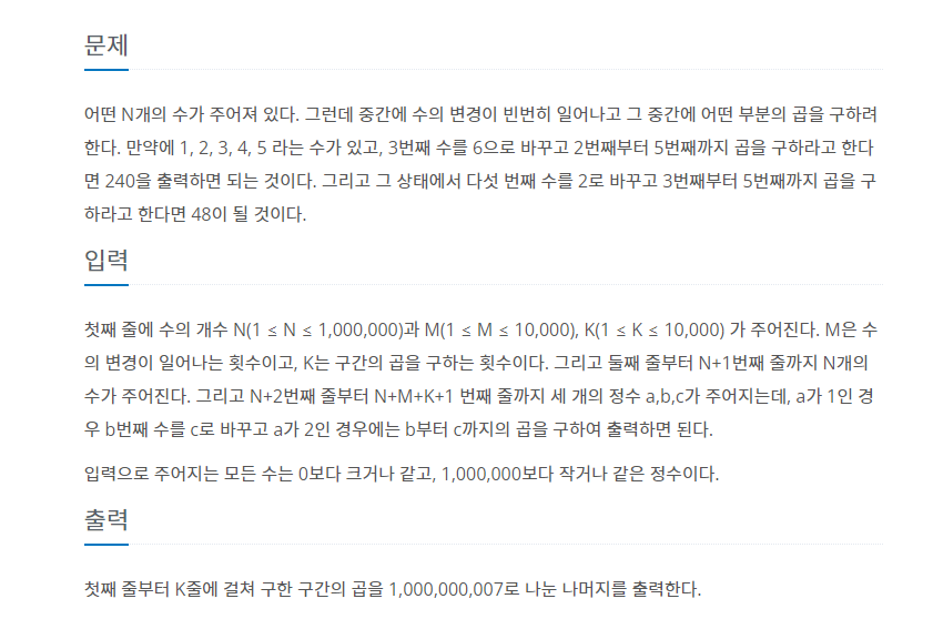 첫째 줄에 수의 개수 N(1 ≤ N ≤ 1,000,000)과 M(1 ≤ M ≤ 10,000), K(1 ≤ K ≤ 10,000) 가 주어진다. M은 수의 변경이 일어나는 횟수이고, K는 구간의 곱을 구하는 횟수이다. 그리고 둘째 줄부터 N+1번째 줄