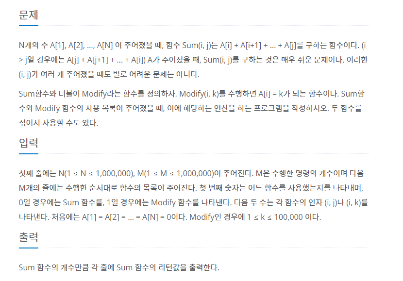 - 해당 문제는 세그먼트 트리에서 트리를 만드는 과정에 없어지고 modify와 sum만하면 풀 수 있도록 만들어진 문제다