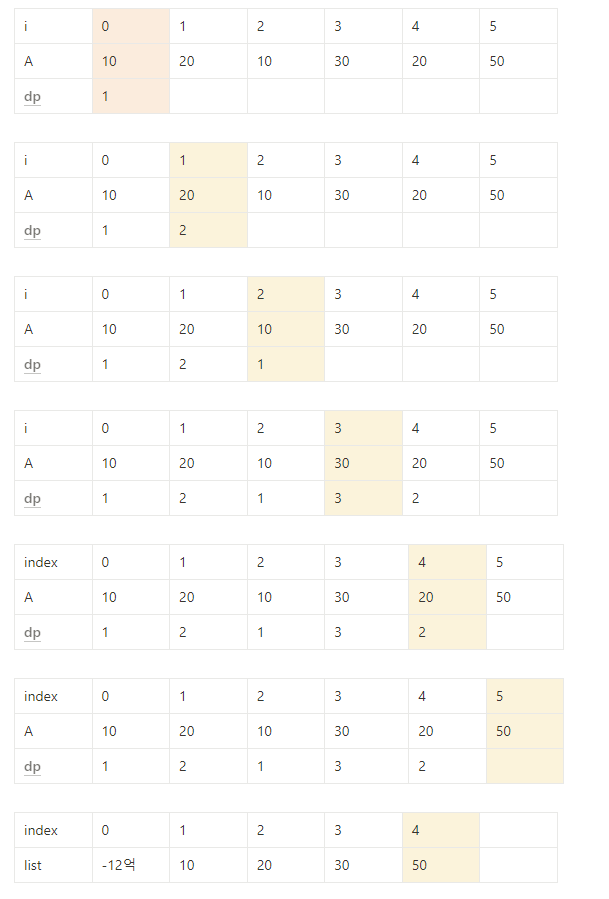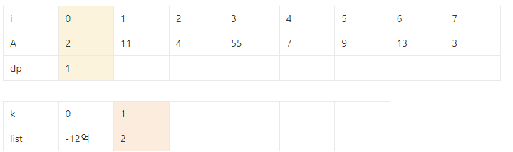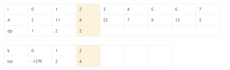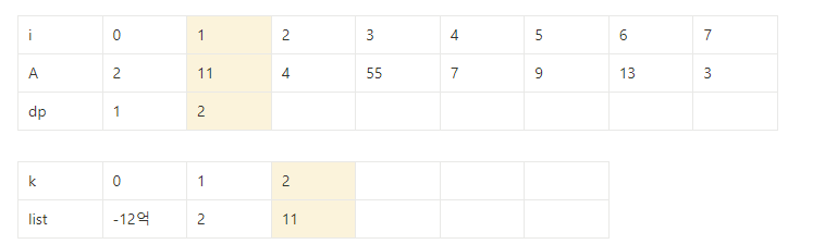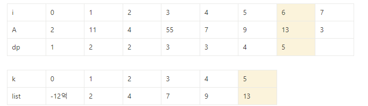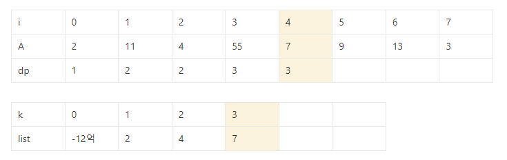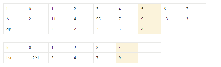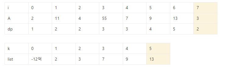 ⇒ dp[j] =k를 만족하는 j중 A[j]의 값이 가장 작은 값만 저장해 높으면 전체를 다 확인할 필요가 없다.