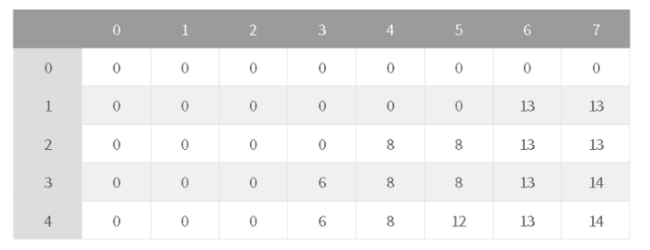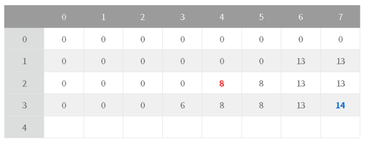 나머지 칸들도 계산해보면 마지막 칸에는 결국 14가 들어가고, 이 마지막 칸의 값이 최종적인 답 (최적의 총 가치) 이 된다.
