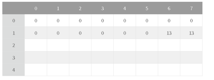 [1.6]인 경우에는 이제 1번 물건을 넣을 수 있으므로 DP[1, 6] = 13이 된다