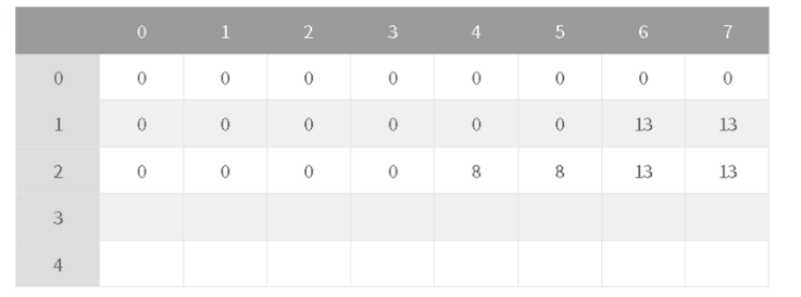 일단 i가 0인 경우는 넣을 물건이 없는 것이므로 다 0이고, w가 0인 경우는 배낭에 넣을 수 있는 무게가 없다는 것이므로 다 0이다. 첫번째 행이랑 첫번째 열은 다 0으로 채워 넣고 시작한다.