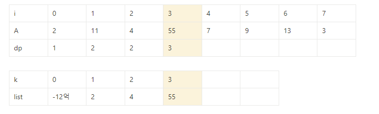 A[3]인 55가 list의 마지막 값인 4보다 크다. list의 55를 추가해주고, dp[3]=3을 넣어준다