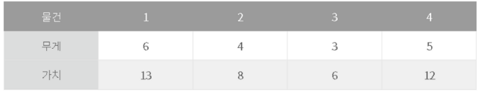 - 물건을 쪼갤 수 있는 배낭문제의 경우는 가치가 큰 물건부터 담고, 남은 무게 만큼 물건을 쪼개는 방식으로 그리디 알고리즘으로 해결할 수 있다.