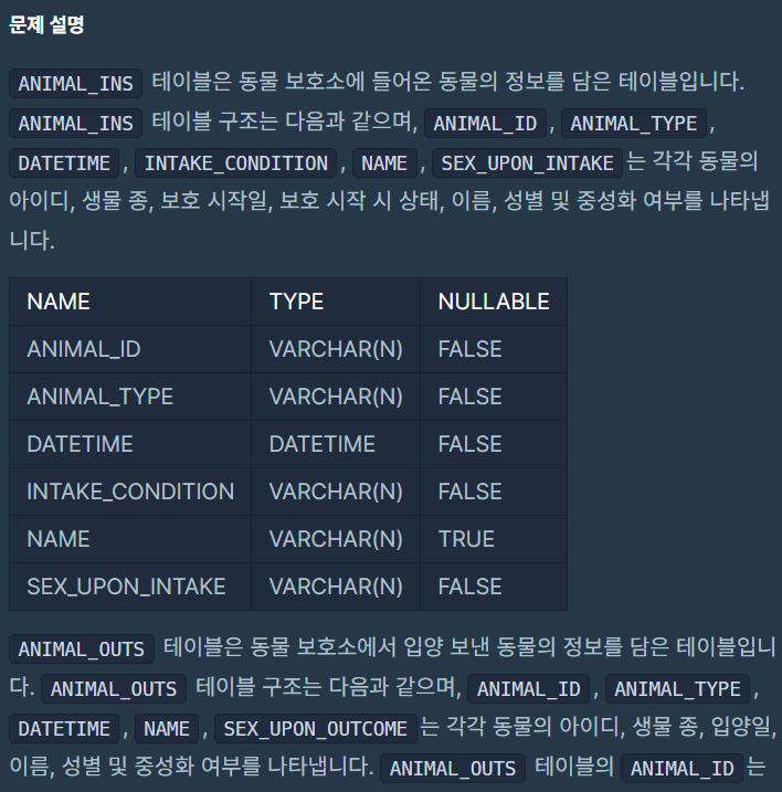 ON ANIMAL_INS.ANIMAL_ID = ANIMAL_OUTS.ANIMAL_ID -- 나간애들 기준으로 아이디를 출력 만약에 들어왔는데 안나갔으면 널로 출력이 된다.