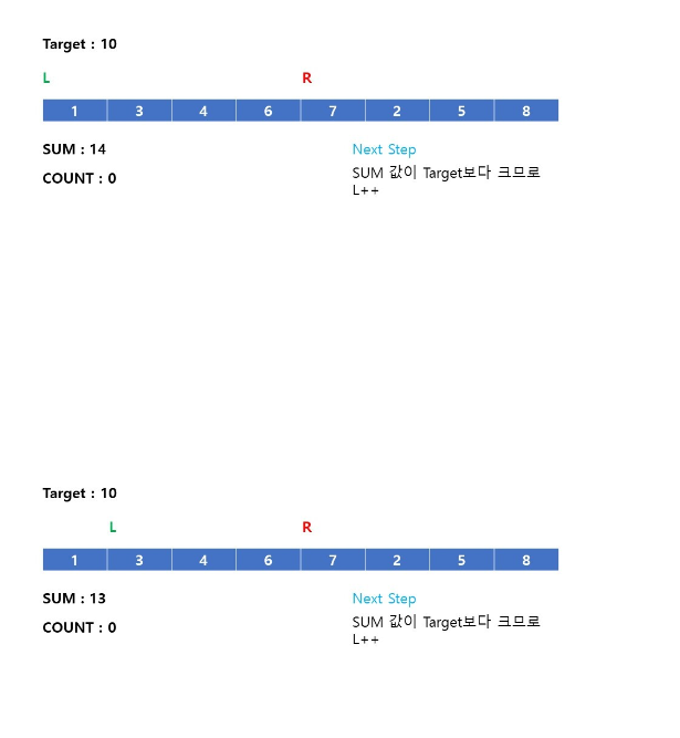 (2) 부분 배열의 합이 Target 값보다 작으면 Right = Right + 1 (부분 배열의 길이를 늘려 합을 더한다.)