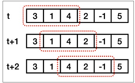 - 배열의 부분 합을 구하는 문제 : 오른쪽으로 한 칸 옮기고 옮기기 전 부분 배열과 옮기고 난 후에 겹치는 부분이 존재할 때, 기존 구간에서 빠지게 되는 부분인 왼쪽의 값을 삭제하고 새로 추가되는 오른쪽 값을 삽입한다.