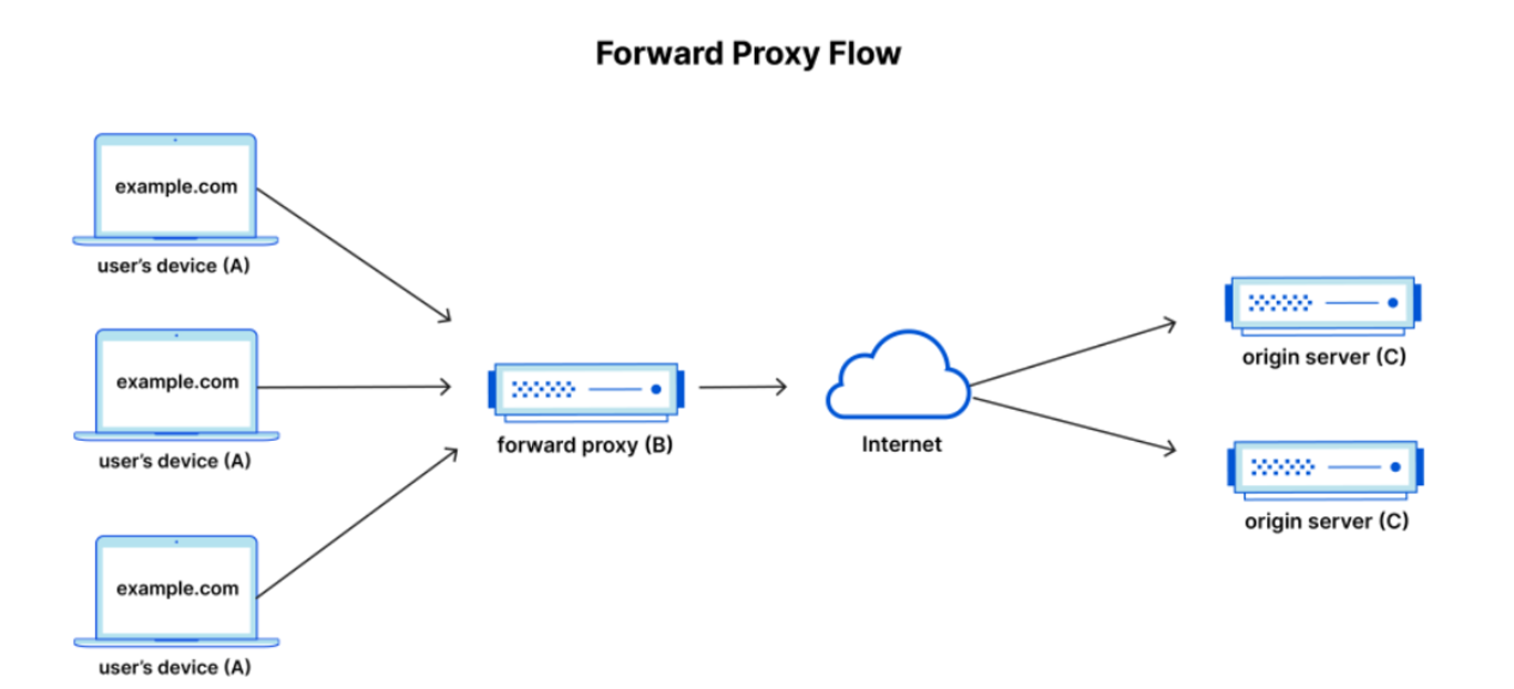 - 포워드 프록시 : 클라이언트와 인터넷 사이에 있는 영역을 의미함. 클라이언트가 어떠한 정보를 요청하면 포워드 프록시가 이를 대신 받아 서버에게 전달.