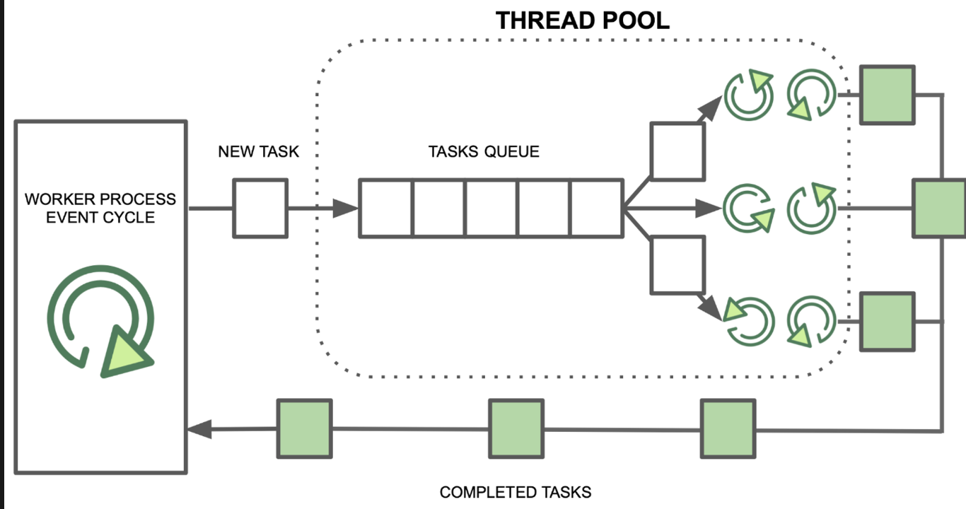 - Nginx Event Driven 내에서 Event Handler에서 작업을 마치게 되면 완료된 순서대로 Queue에 쌓이고, Event Loop을 돌면서 Queue에 완료된 작업이 있는지 체크하면서 CPU가 IDLE 한 상태가 없도록 활동함