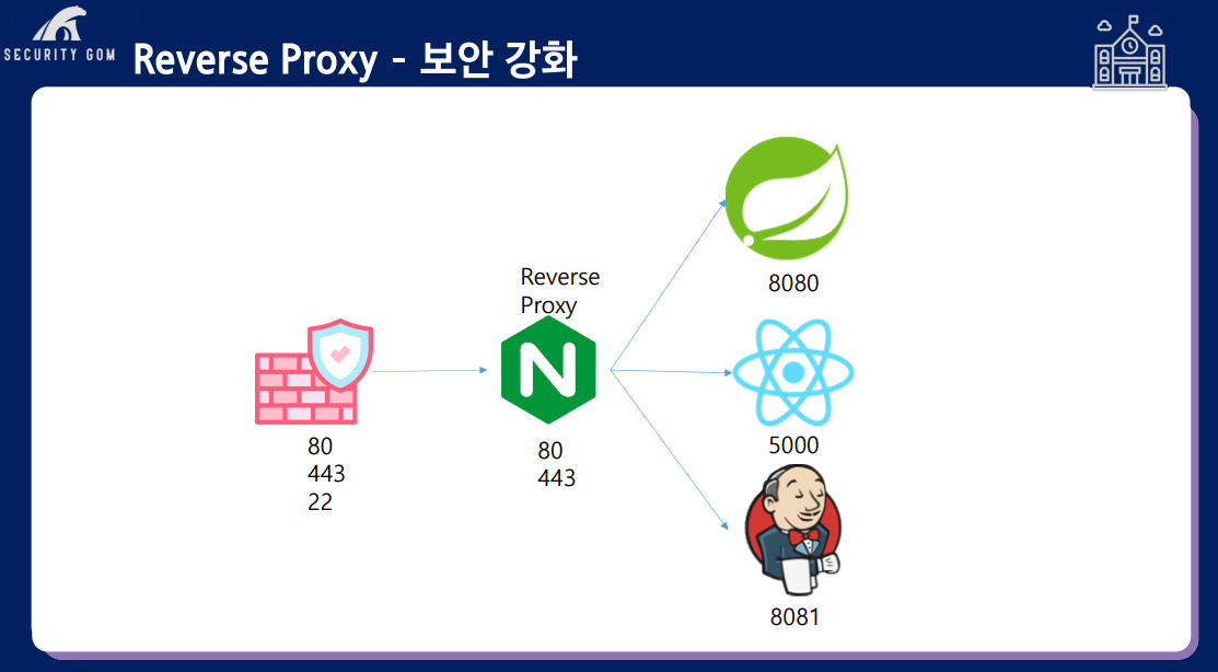 즉, 방화벽에서 여러 서비스 포트를 Open 하지 않고 단일 포트를 통해 여러 가지 서비스를 운영할 수 있고 Proxy Server에서로깅이 가능하기 때문에 보안적으로 이점을 가져갈 수 있습니다.