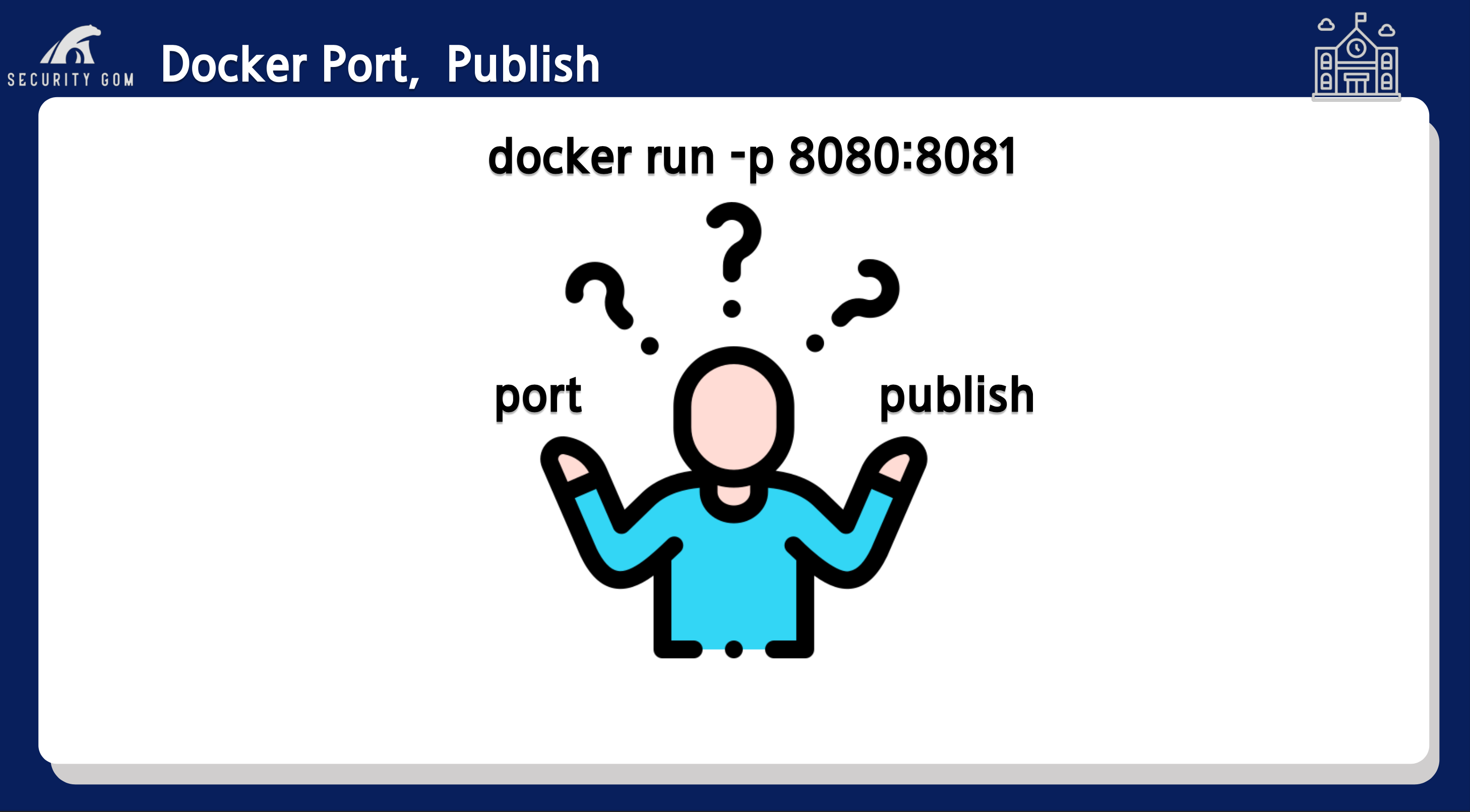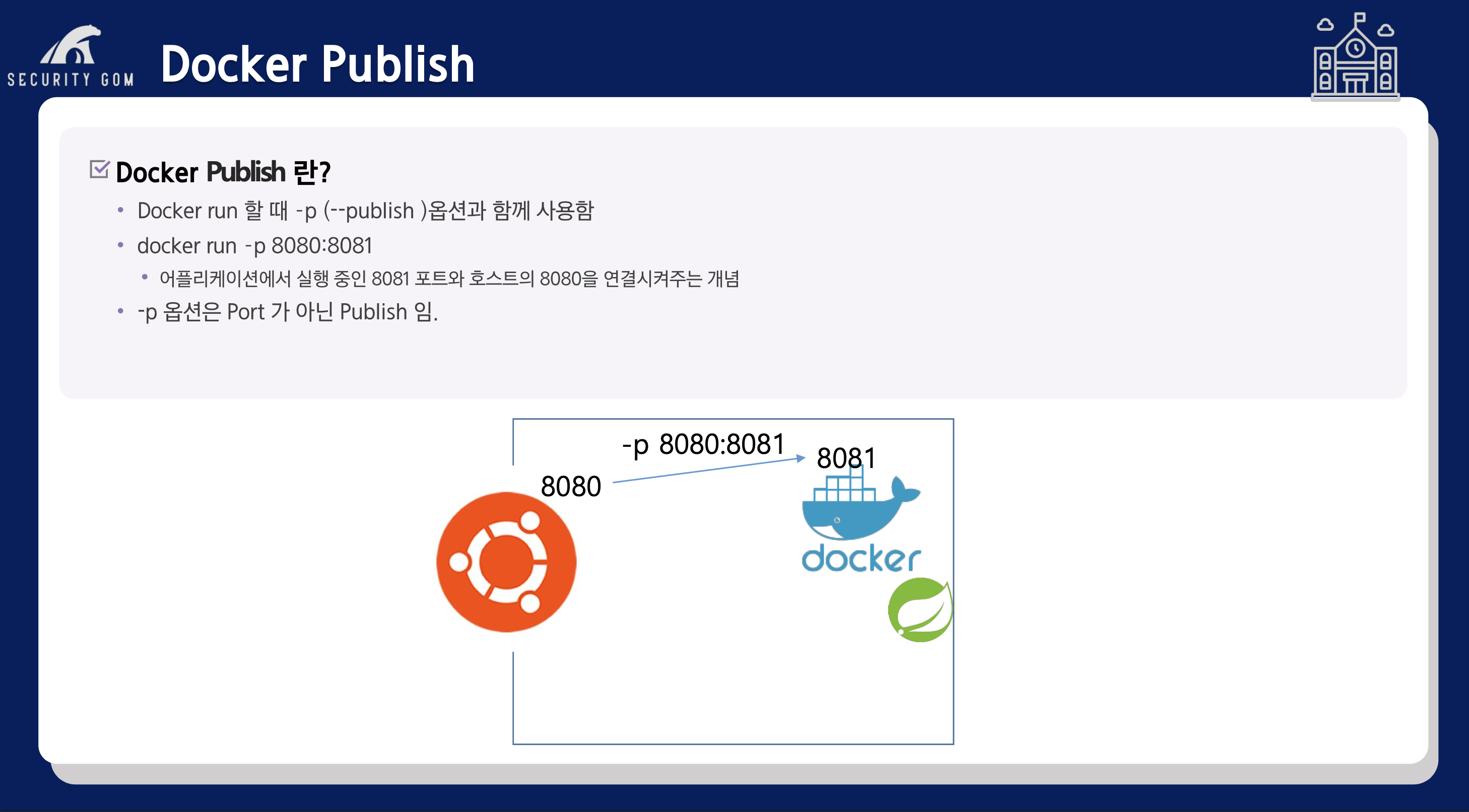잘 알고 계시겠지만 사실, port가 아닌 Pulish의 약자이며 --publish의 약어로-p를 사용하고 있는 것입니다.