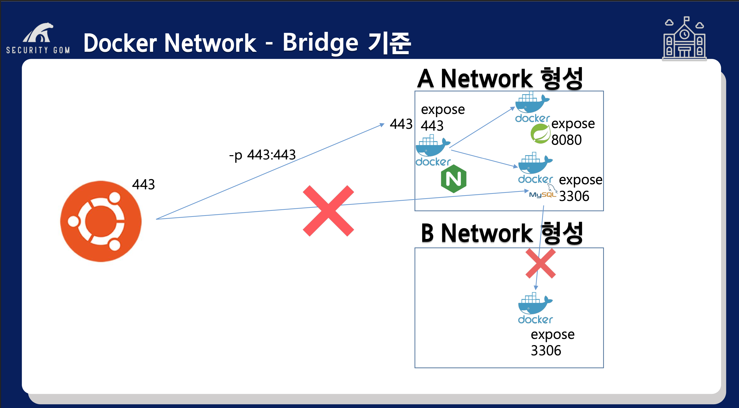 또한, A 네트워크에서 B네트워크의 expose 3306으로 생성되어 있는 컨테이너 접근 또한, 불가능합니다.