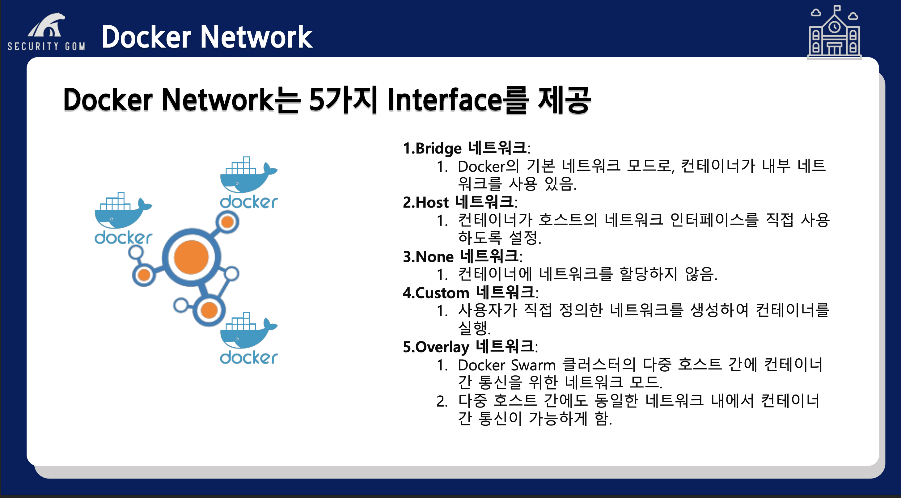 Docker 환경에서의 네트워크는 크게 5가지로 나누어지게 됩니다.