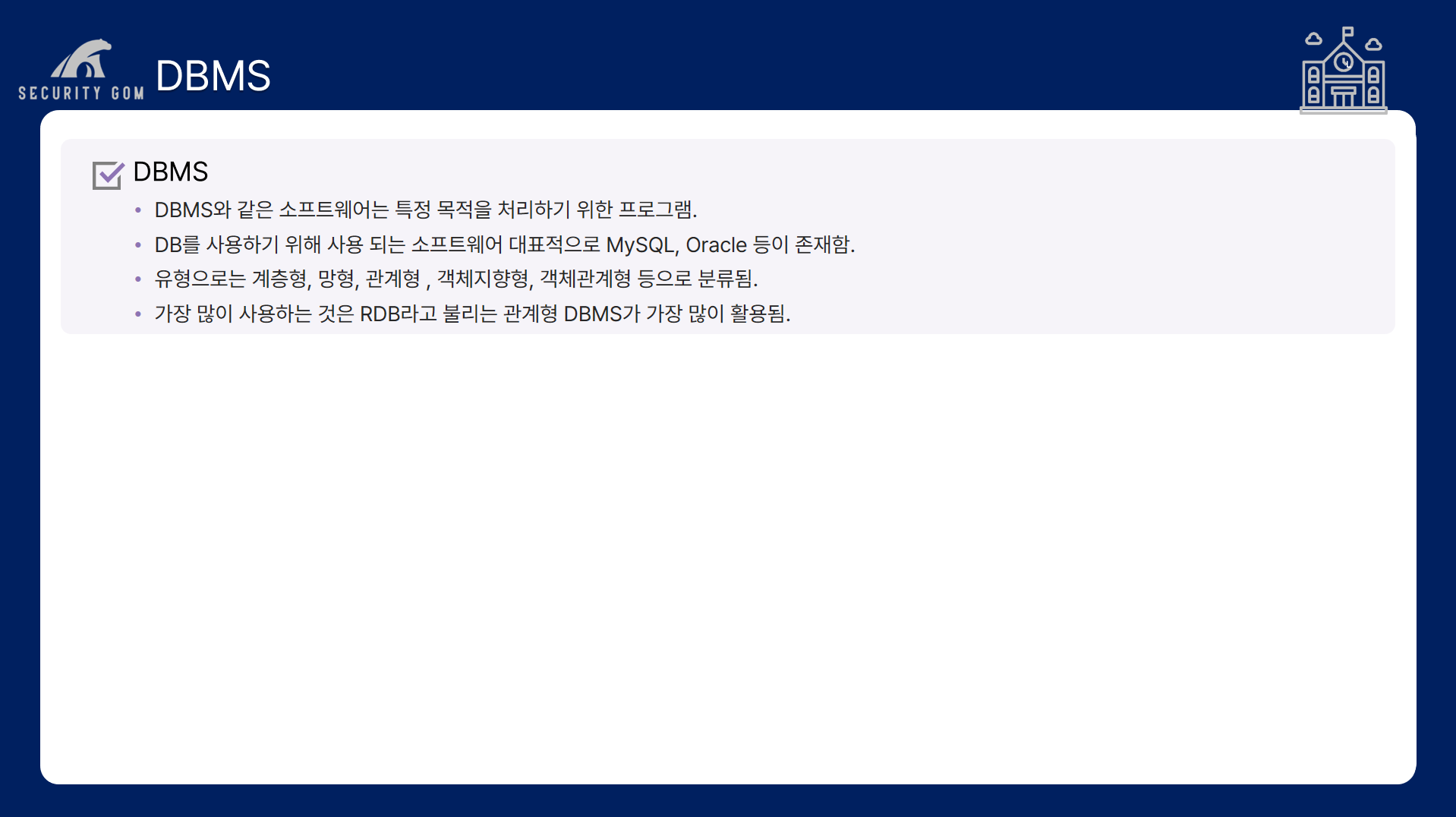 DBMS는 DB를 사용하기 위해 사용되는 소프트웨어입니다.