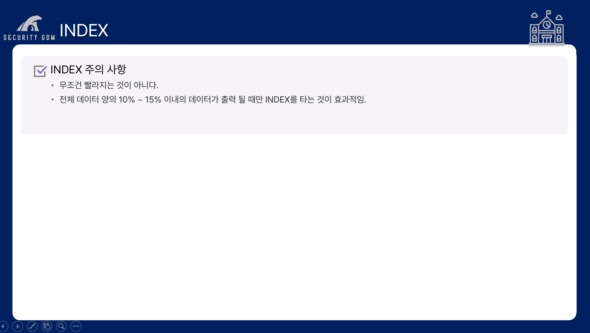 조회하고자 하는 데이터가 전체 데이터의 10 ~ 15% 이내일 경우에만 Index를 타는 것이 효과적입니다.