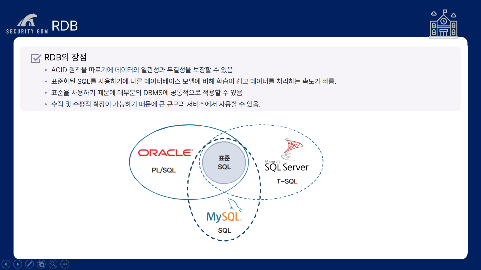 표준화된 SQL를 사용하기에 다른 데이터 베이스 모델에 비해 학습이 쉽고 데이터를 처리하는 속도가 빠른 편입니다.