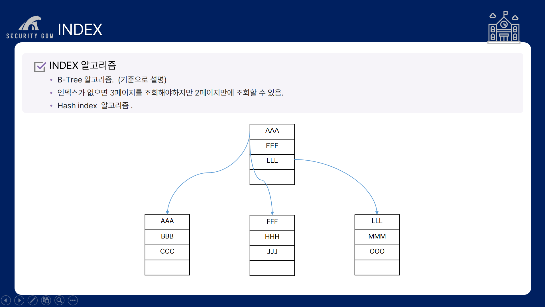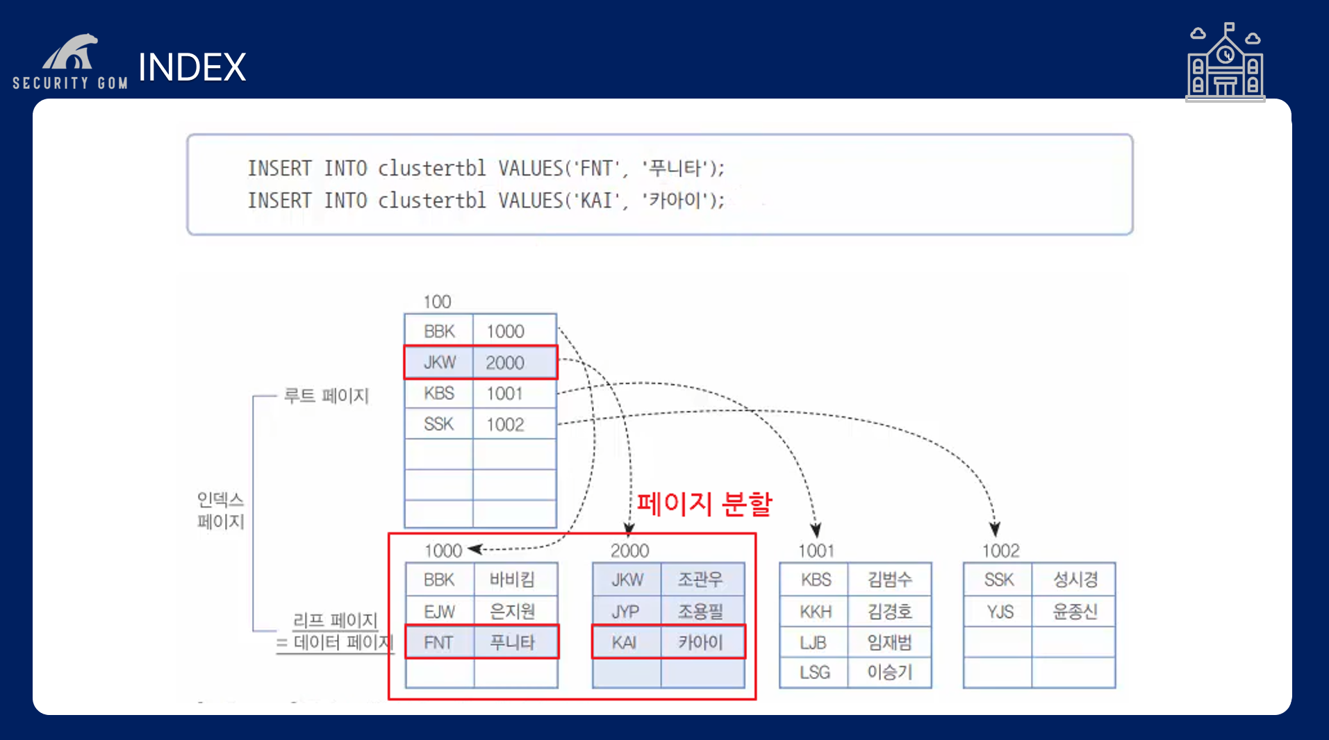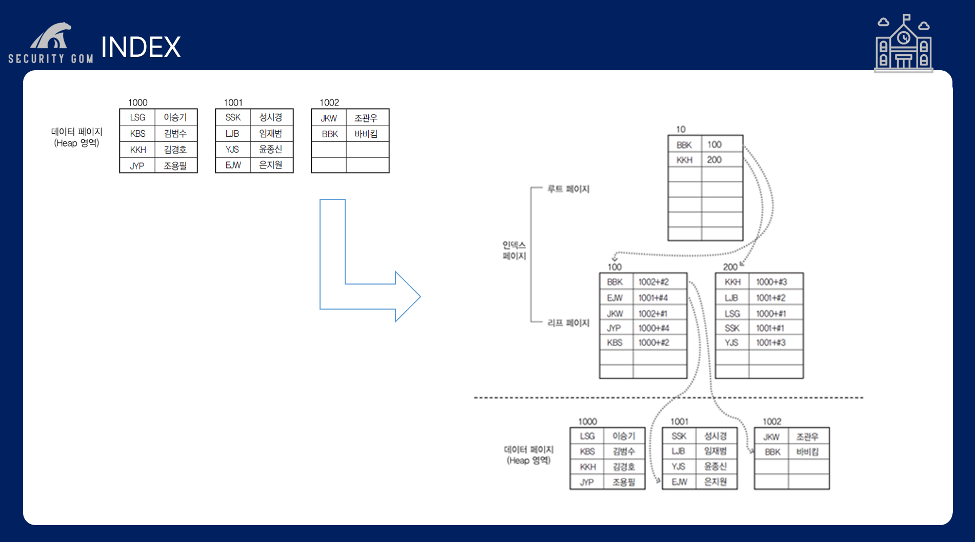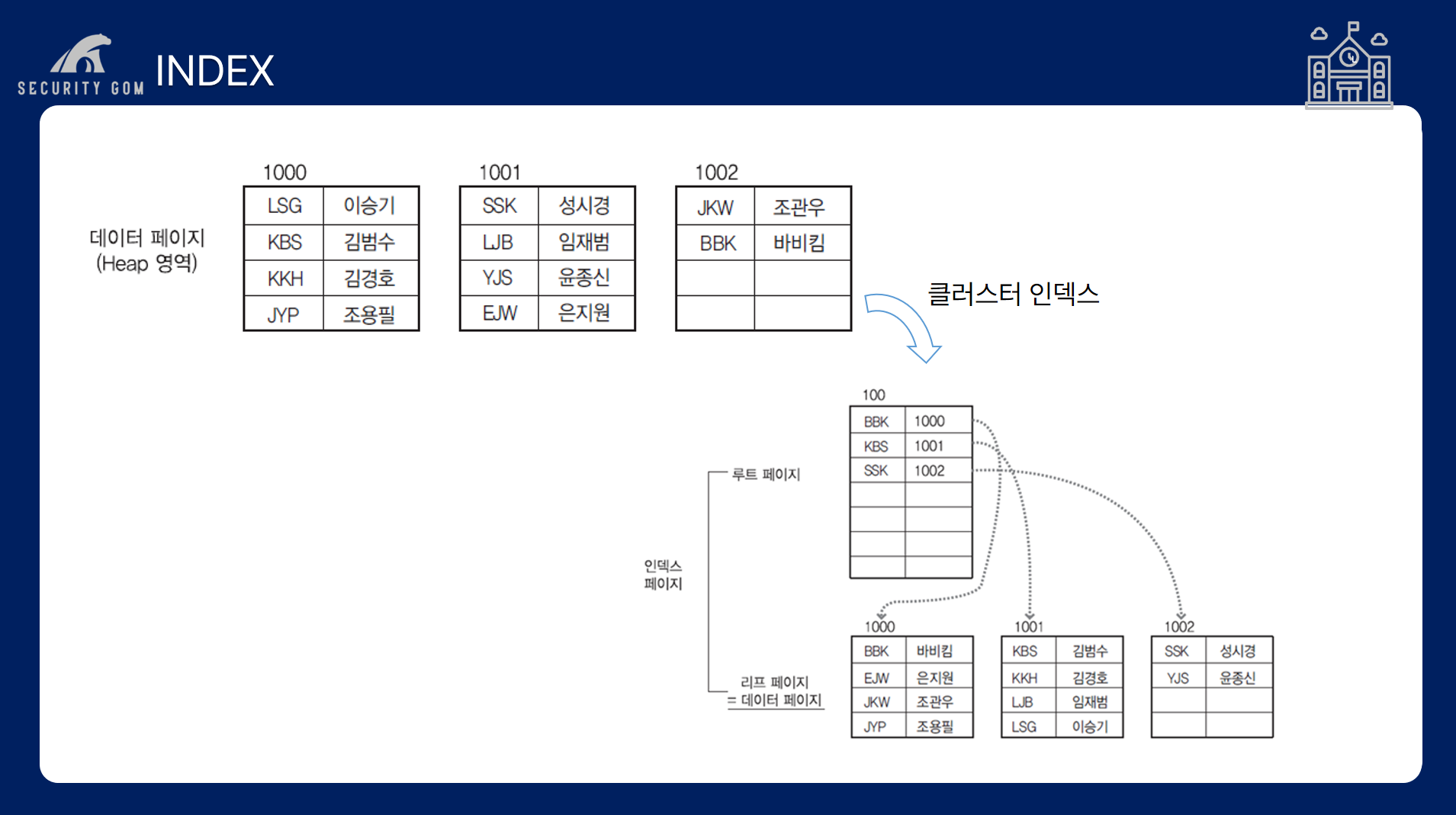 만약, LJB 임재범을 찾고 싶다면 루트 페이지에서 KBS로 들어가는 작업과 이와 매핑된 1001번 페이지에 들어가서 임재범을 찾는 과정 즉, 2페이지 만에 조회가 가능하게 됩니다.