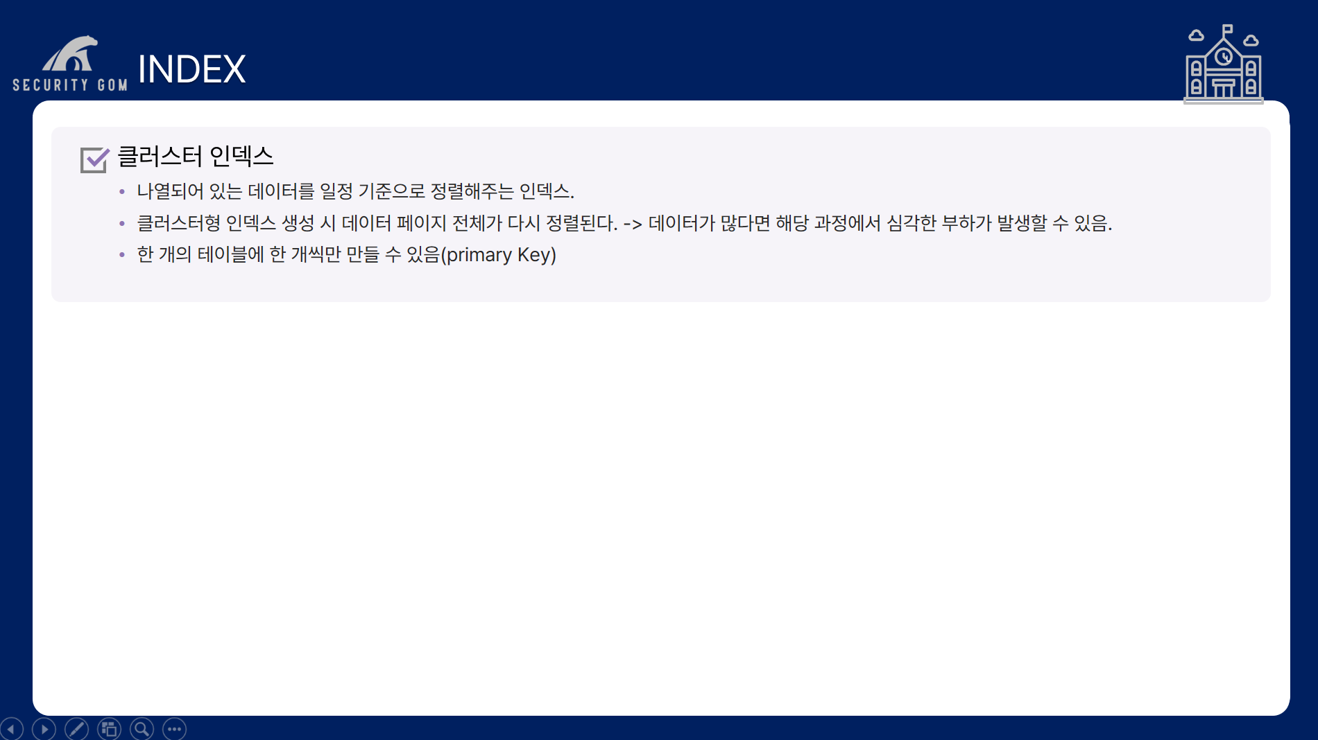3. 클러스터 인덱스보단 속도가 느리지만 수정/ 삭제/ 삽입의 경우 덜 느리다.