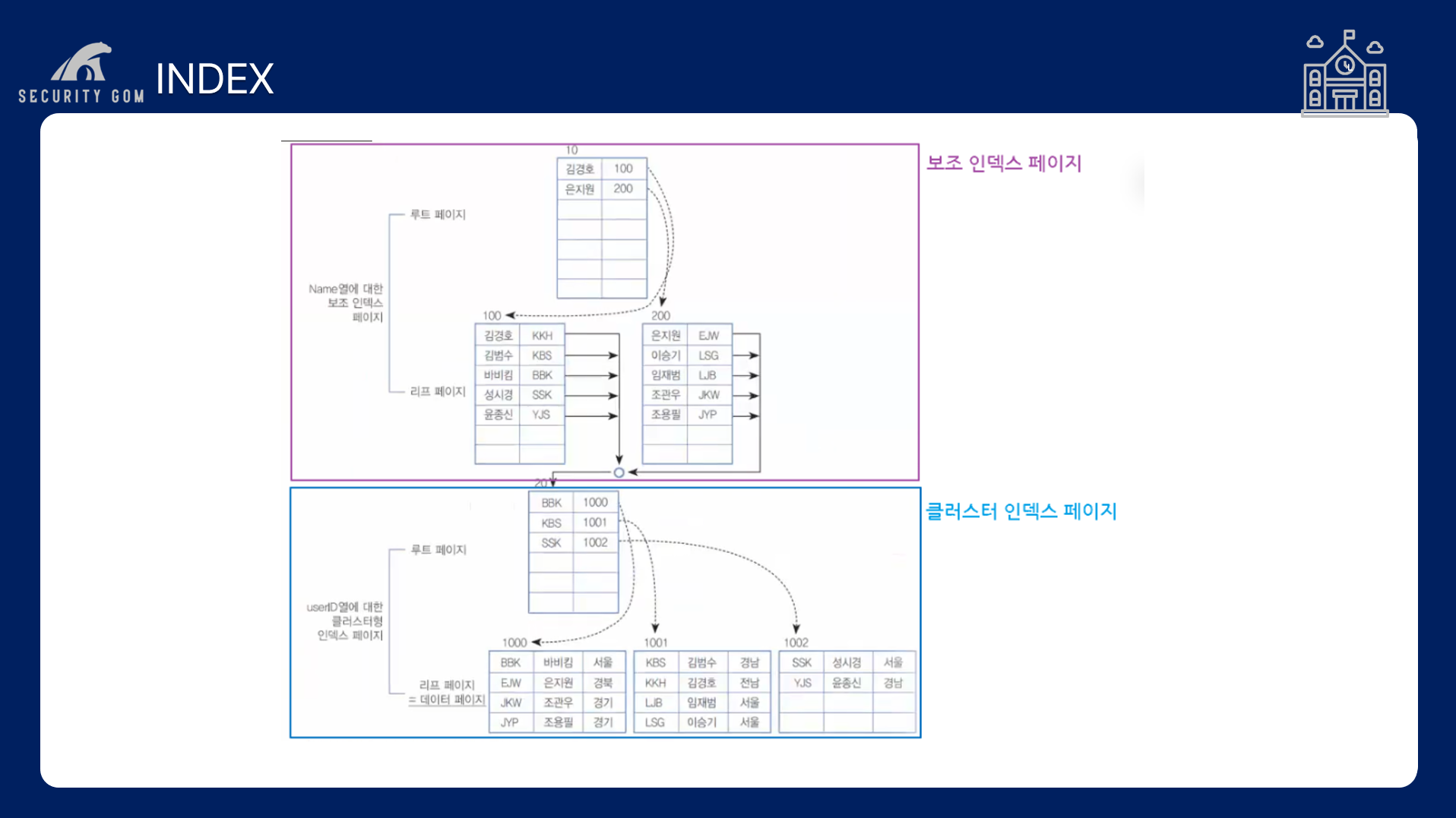 클러스터 인덱스와 보조 인덱스입니다.