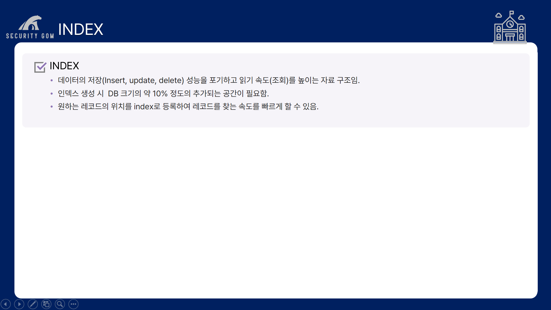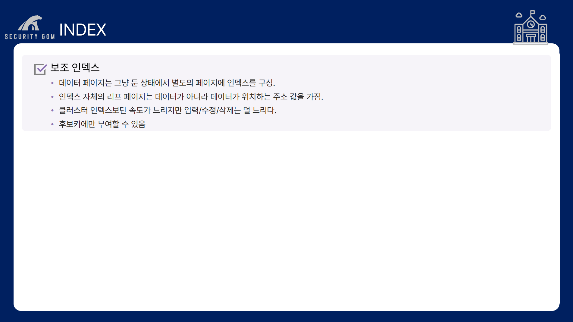 3. 보조 인덱스 대비 검색 속도는 빠르나 입력/ 수정/ 삭제의 경우 더 느리다는 단점이 존재합니다.