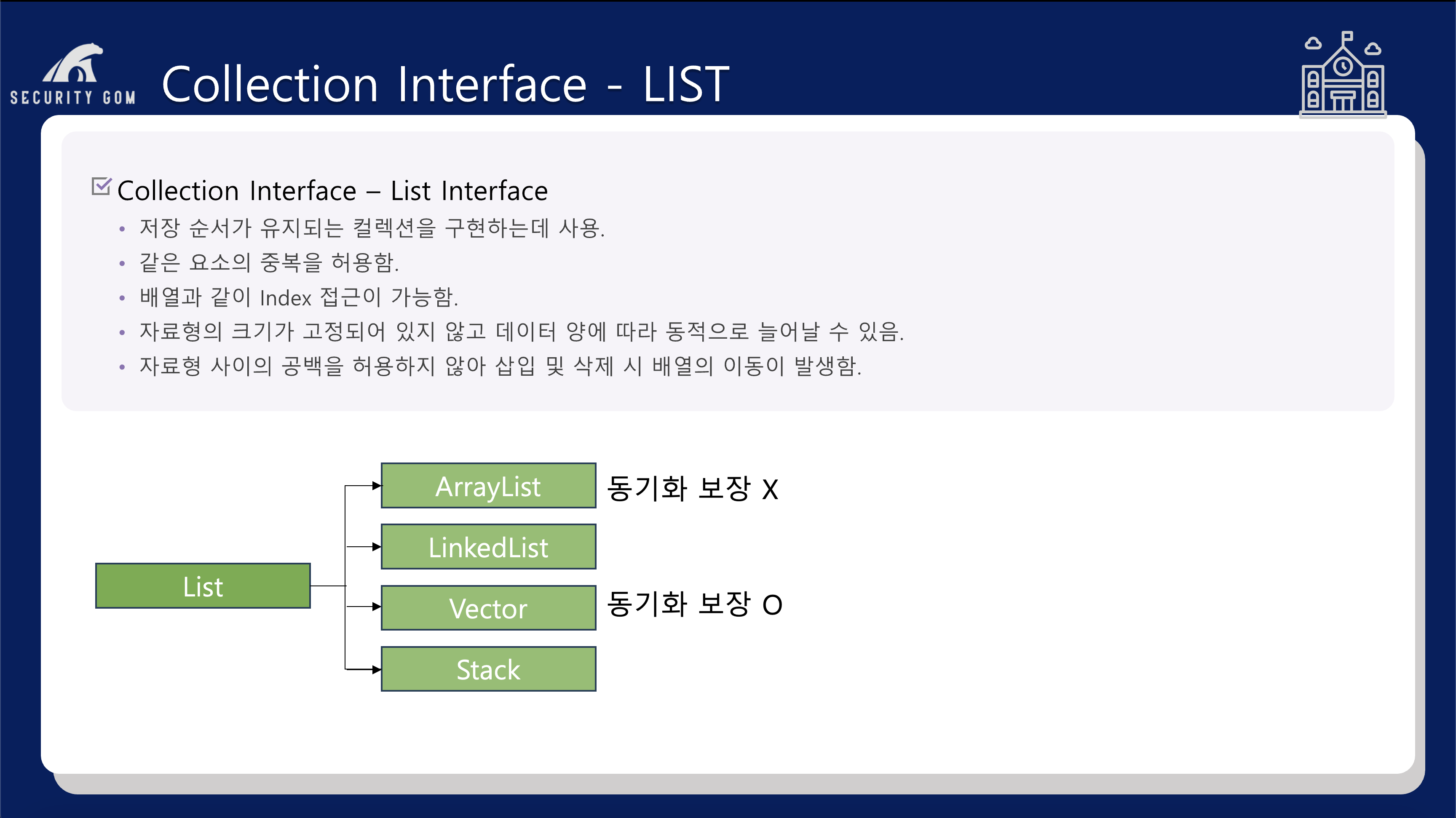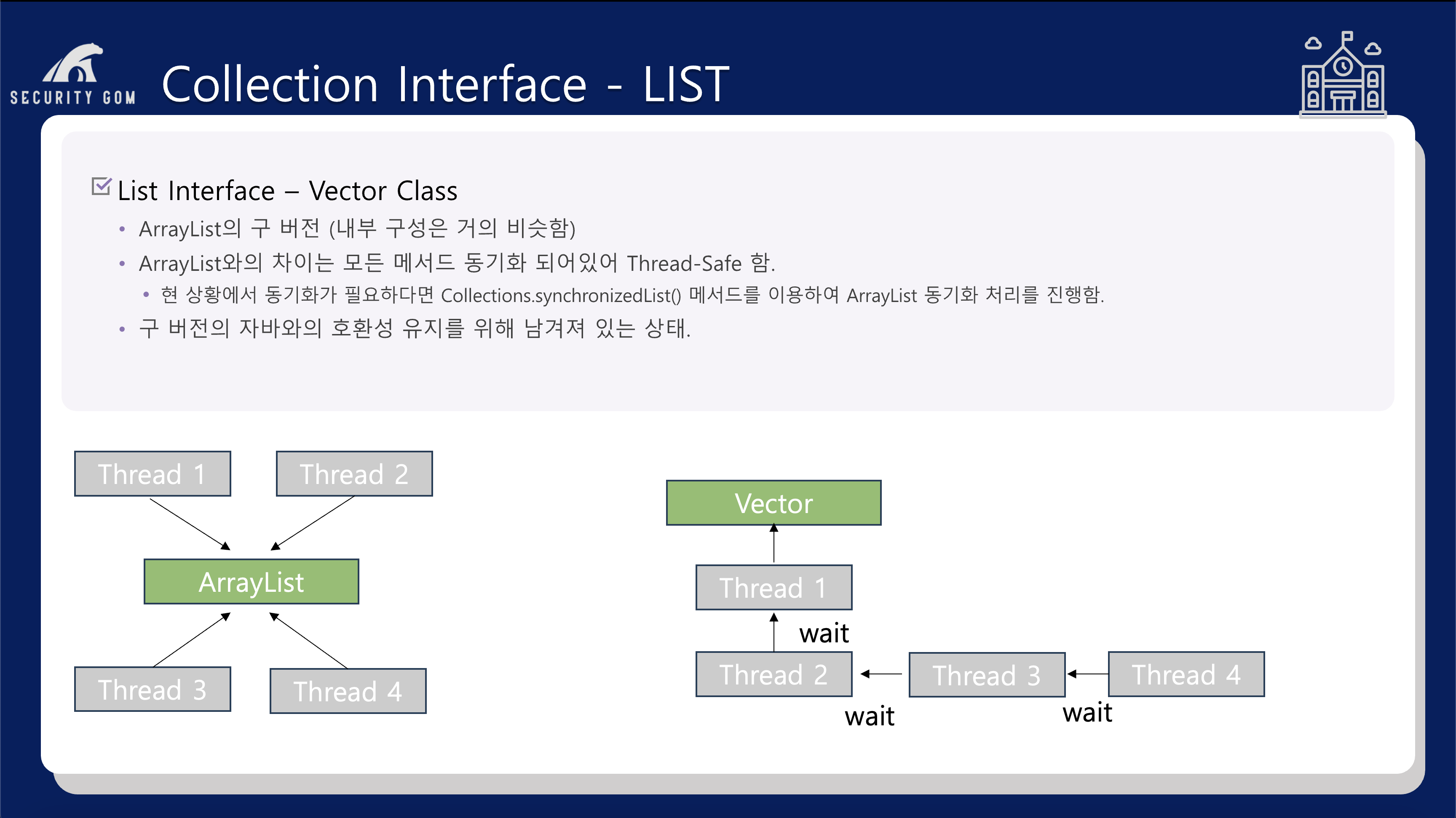현 자바 버전에서는 ArrayList 사용을 권장하고 있으며 동기화가 필요한 경우 Collection.synchronizedList()를 사용하여 ArrayList의 동기화를 권장합니다.