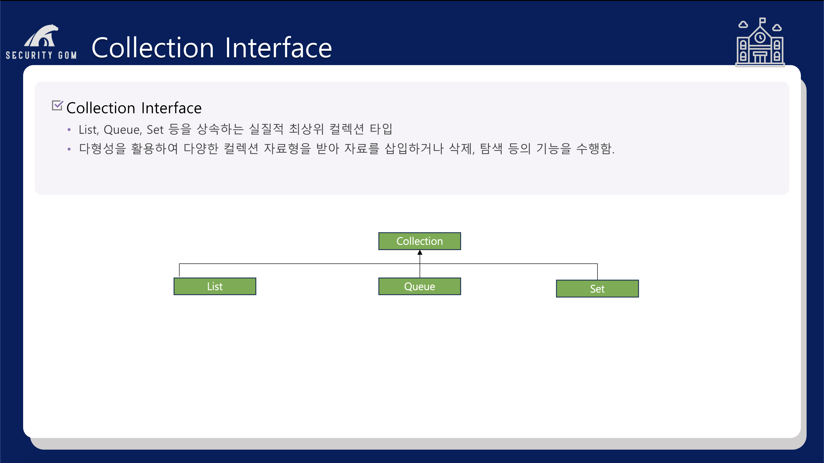 Collection Interface는 List, Queue, Set 등을 상속하는 실질적 최상위 컬렉션 타입입니다.