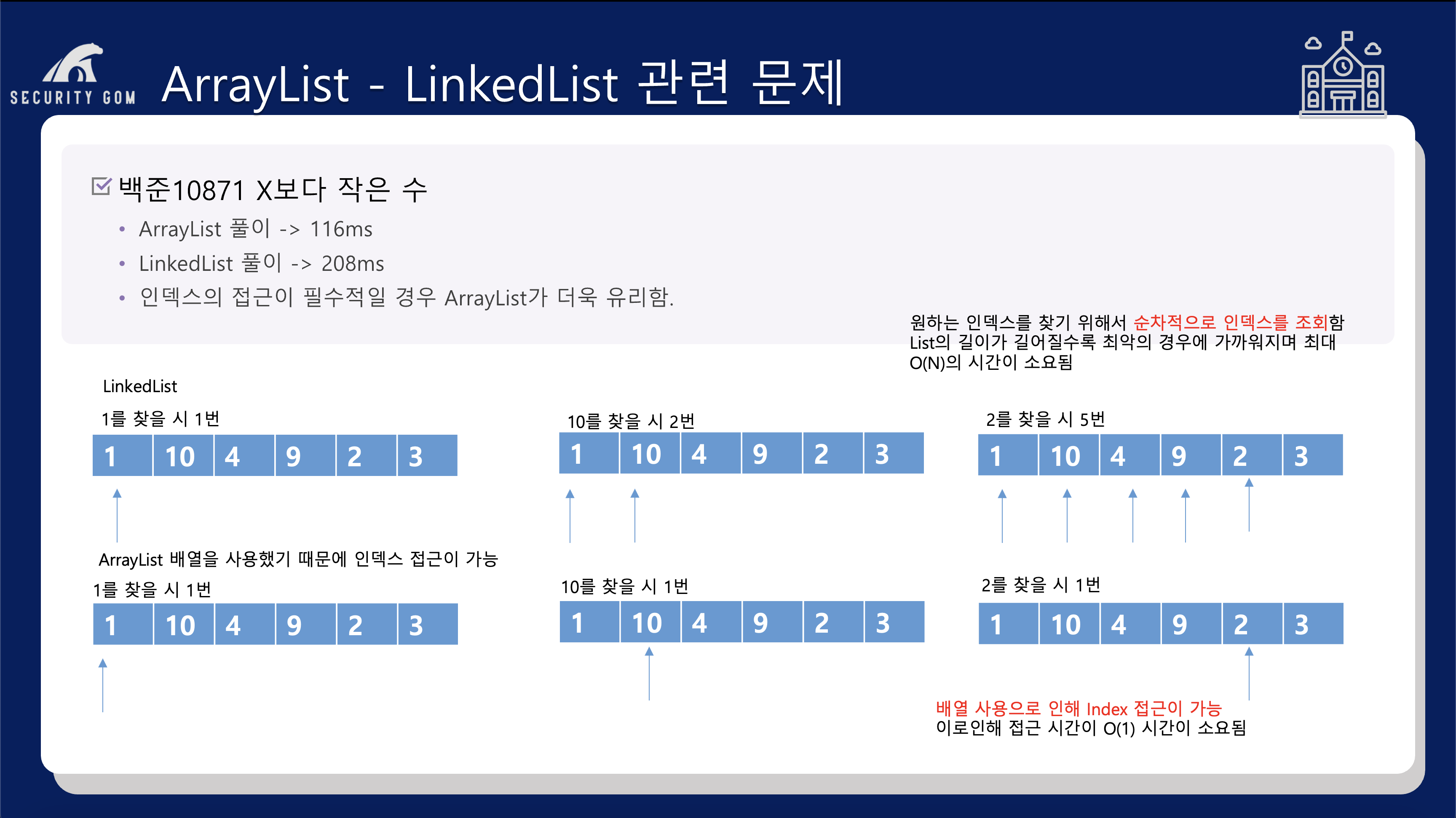 - 중간에 임의의 요소에 접근하는 경우 성능이 좋지 않다는 특징이 있습니다.