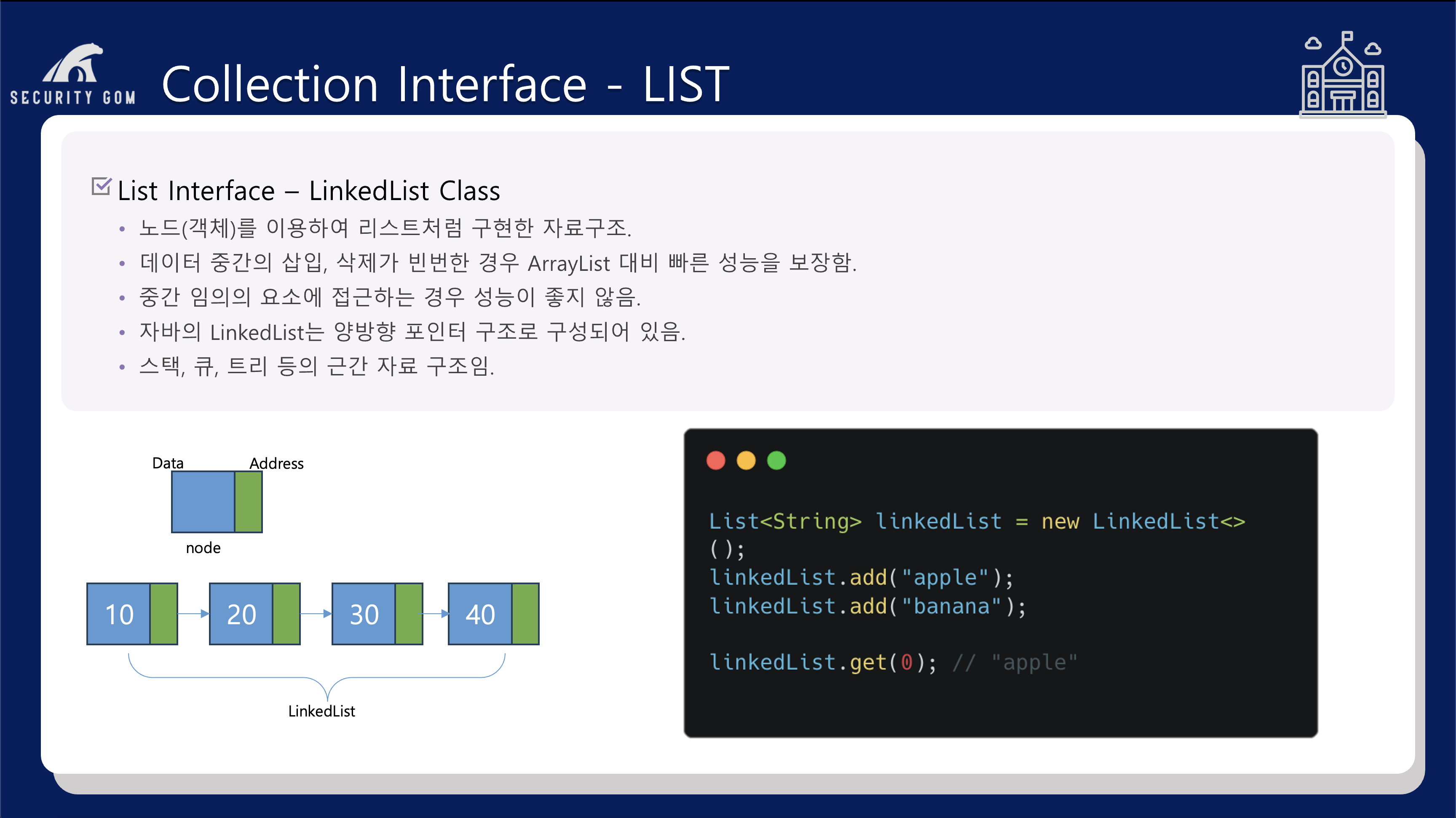 - 자바의 LinkedList는 양방향 포인터 구조로 구성되어 있어 스택, 큐, 트리 등의 근간 자료 구조입니다.
