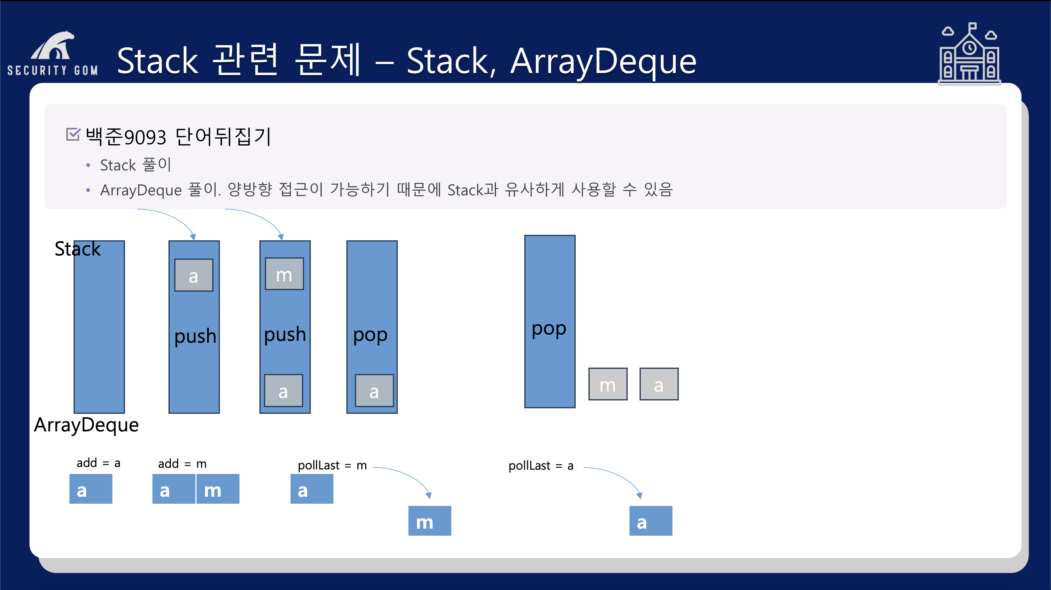 또한, ArrayDeque의 경우 양방향으로 삽입, 삭제가 가능하다는 특징을 가지고 있기 때문에 아래와 같이 Stack과 비슷한 형태로 구현이 가능합니다.