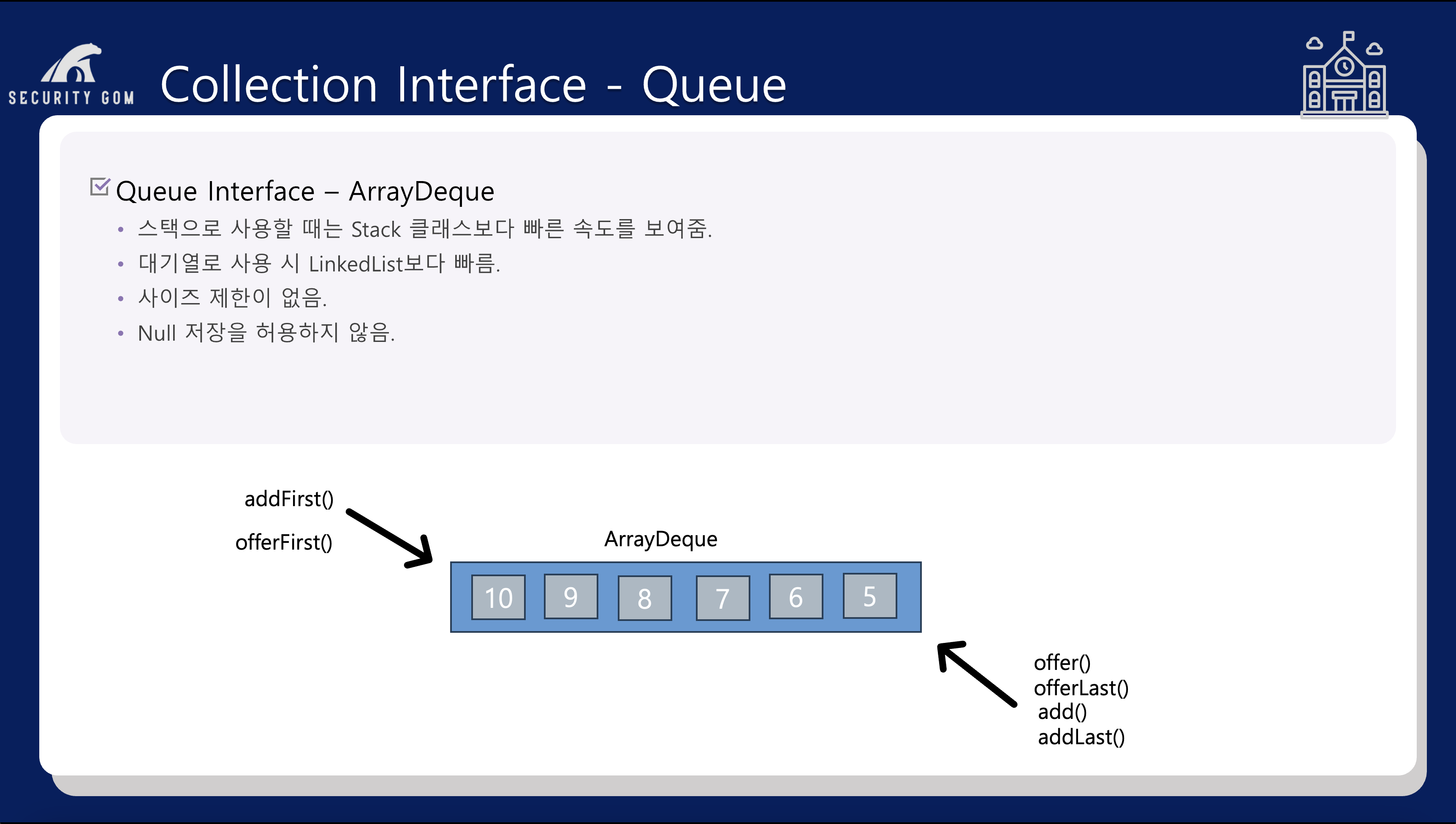 ArrayDeque의 경우 배열을 기반으로 하기에 앞의 데이터가 삭제됨에 따라 빈 공간을 채우기 위해 데이터의 이동이 빈번하게 이루어지기 때문입니다.