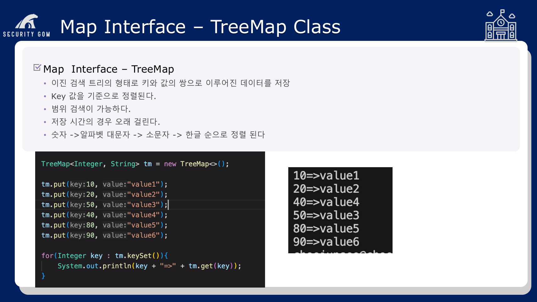 LinkedHashMap과 유사한 특징을 가지지만 순서를 기억하는 것이 아닌 정렬이 된다는 특징을 갖습니다.