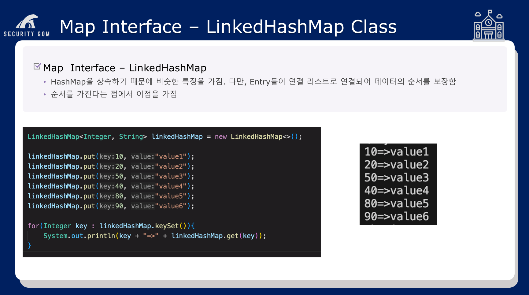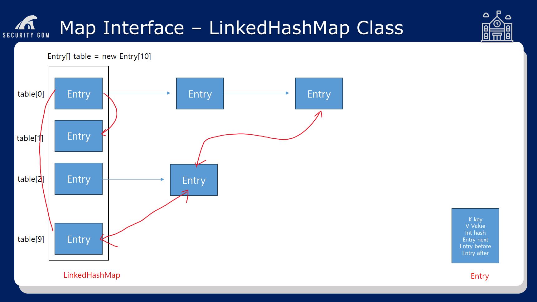해당 자료구조도 동일한 특징을 갖고 있습니다. HashMap의 특징을 가지고 있지만 들어온 순서를 보장한다는 특징을 보여주고 있습니다.